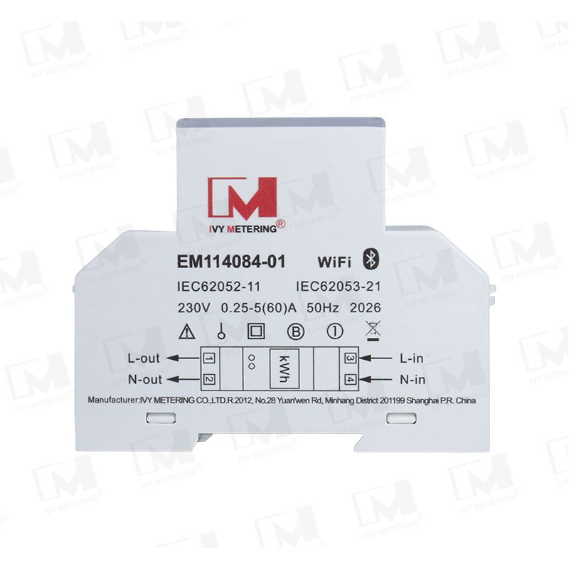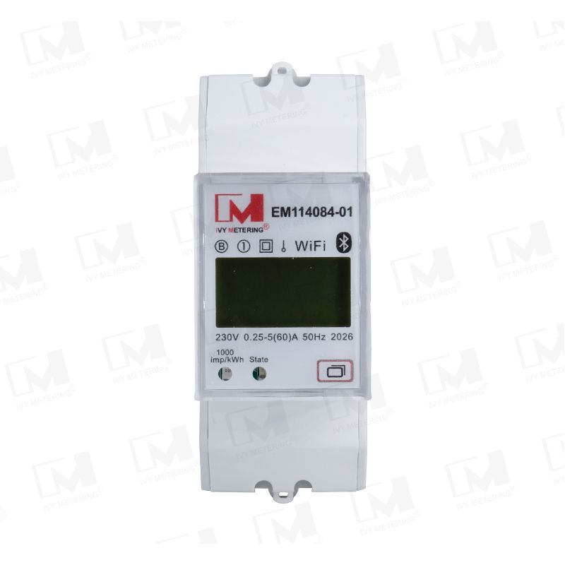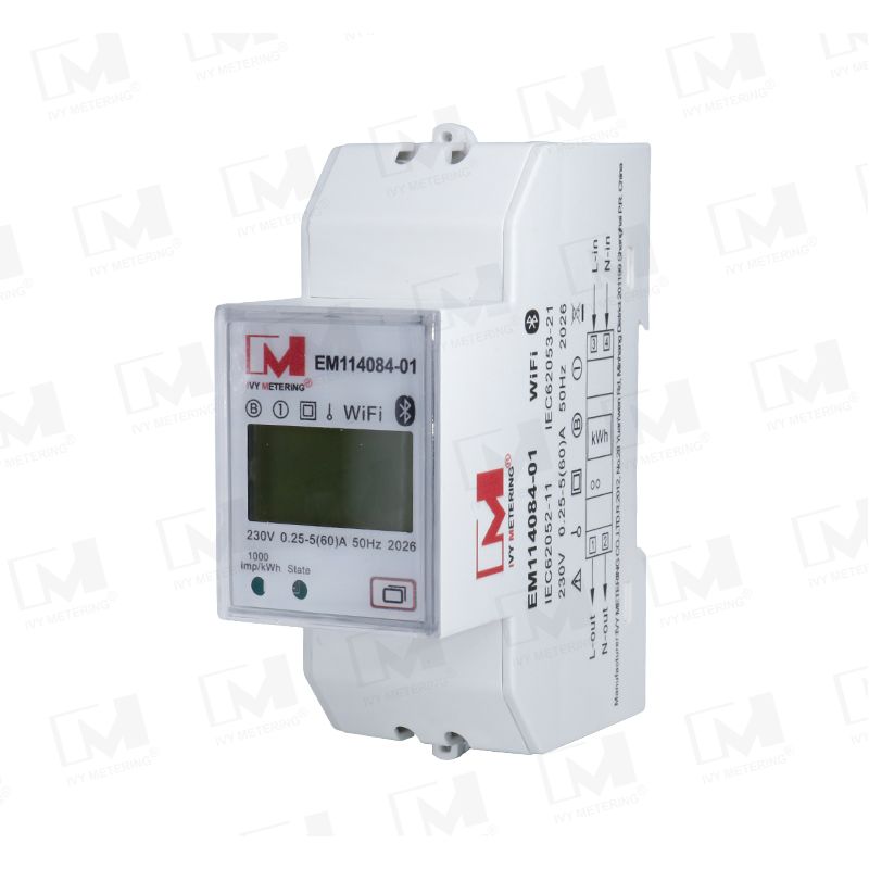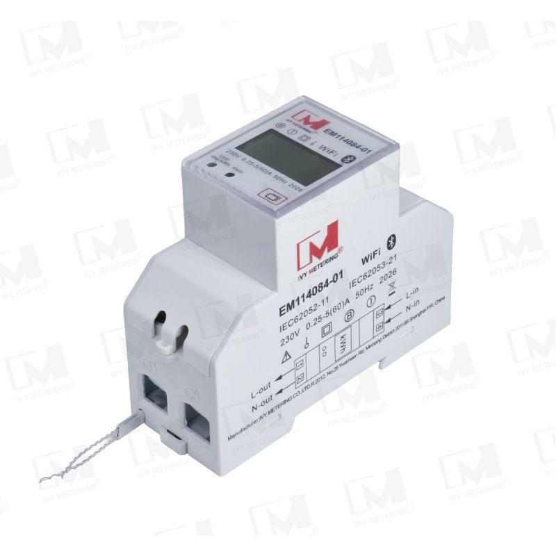 The EM114084-01 is a single-phase two-wire WiFi smart energy meter with built-in relay and IoT communication capabilities.